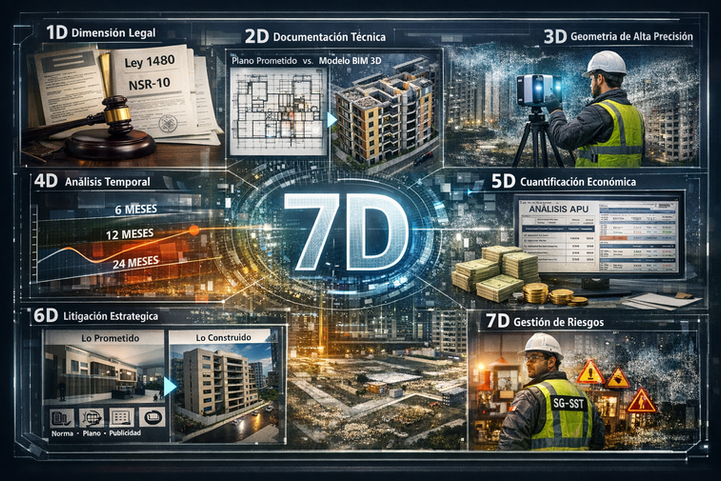 "A diferencia de la interventoría visual, nuestra auditoría 7D despliega tecnología de Escaneo LiDAR para generar un Modelo BIM 3D que demuestra matemáticamente el incumplimiento de la NSR-10, estableciendo el Nexo Causal Forense necesario para exigir la garantía bajo la Ley 1480, incluso antes de que la falla sea visible gracias a nuestra IA predictiva XGBoost."